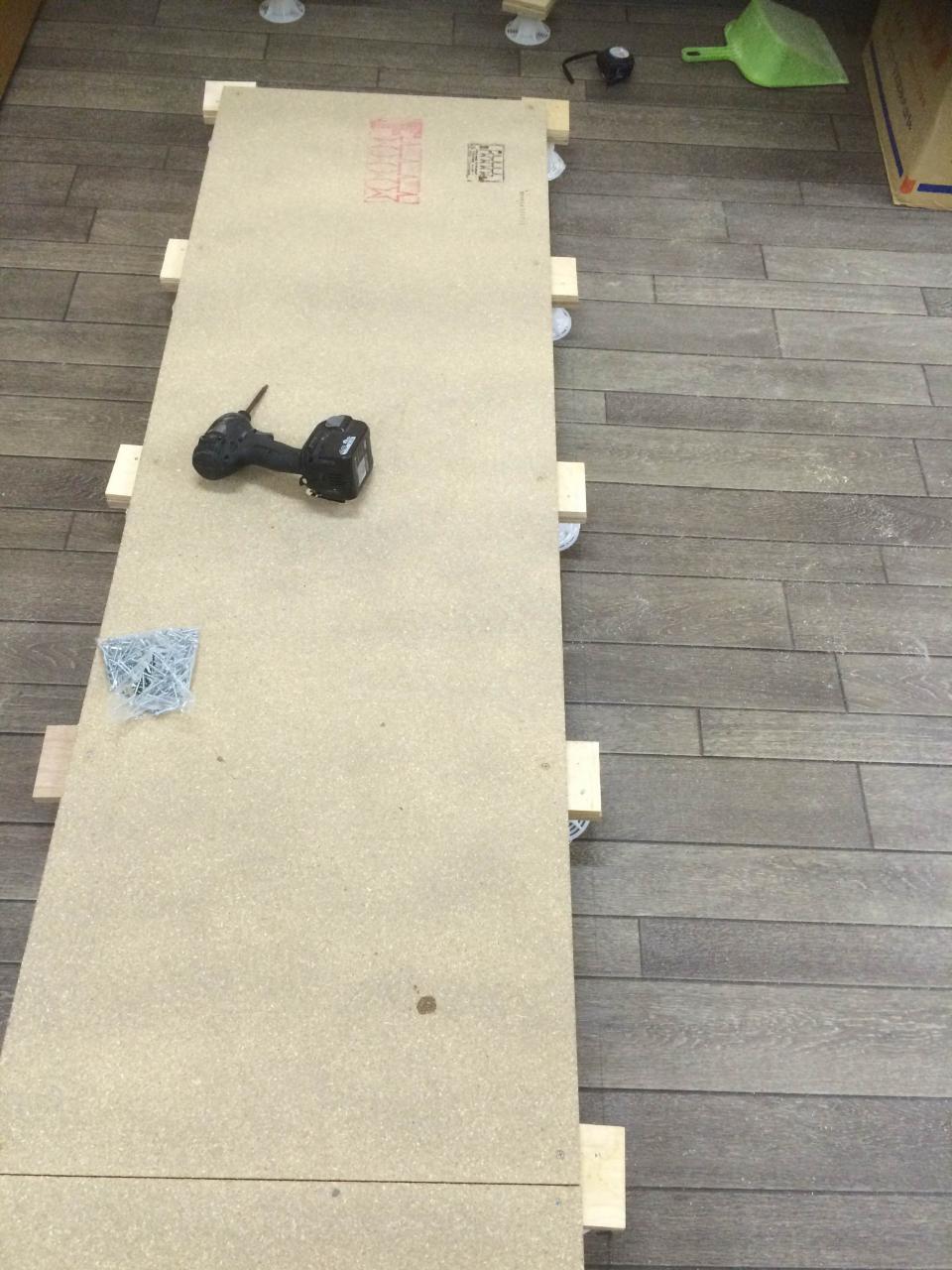 床は、ベニヤに養生し、棚はフリーバンで囲って中はフローリングを貼りました!