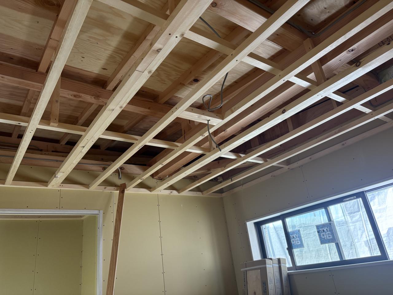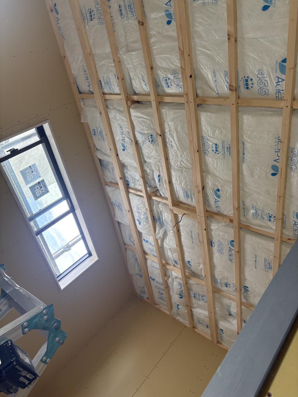 今日は朝から天井の断熱材と天井ボード貼りの作業。